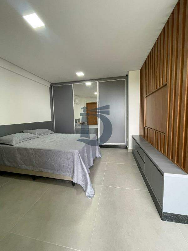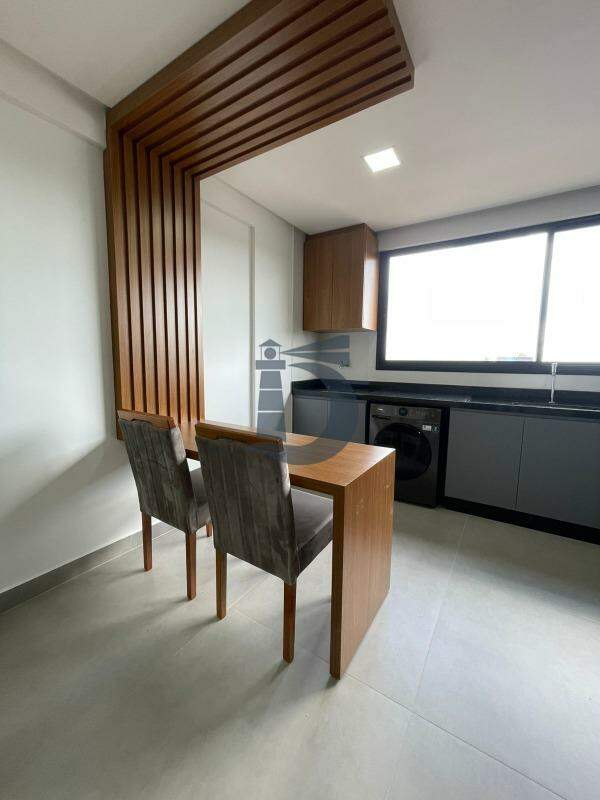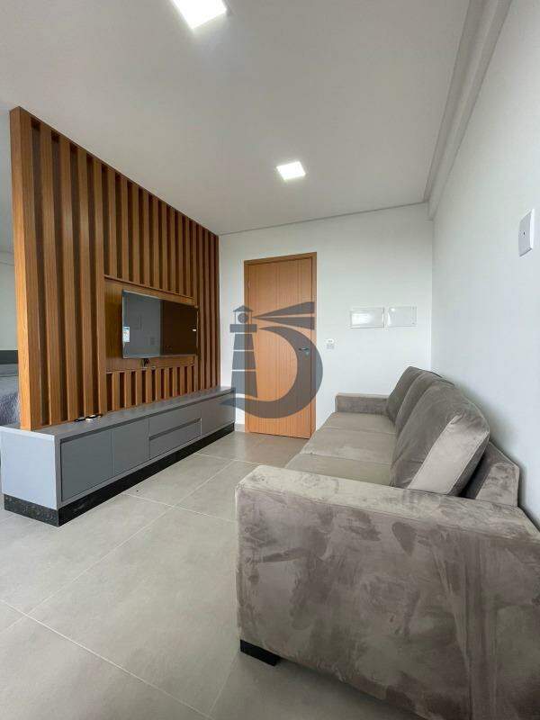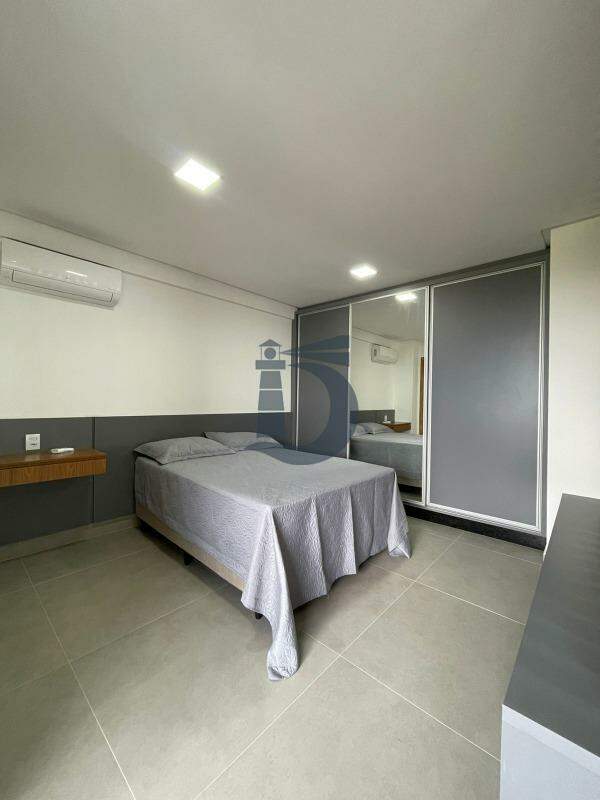 Apartamento no 8º andar com aproximadamente 41m², distribuído em: Sala equipada com sofá, painel e TV, Cozinha com mesa e cadeiras, repleta de armários e integrada à Área de serviço contendo geladeira, fogão, coifa, forno, microondas, bebedouro e maquina de lavar roupa. Dormitório possui cama, guarda-roupa, painel, ar condicionado e um Banheiro social com box de vidro e armário.